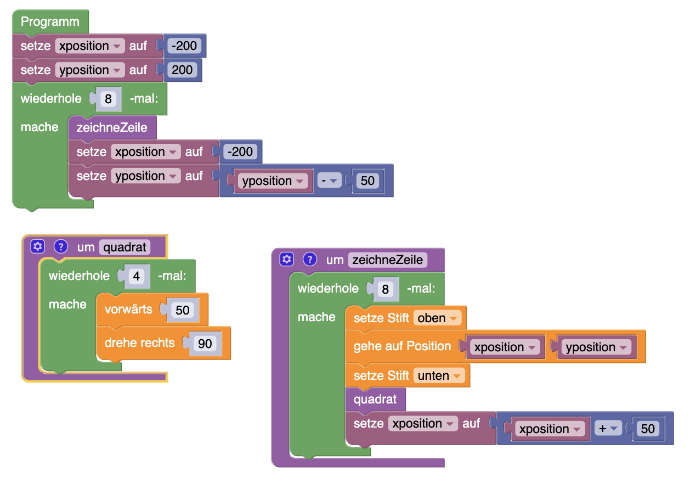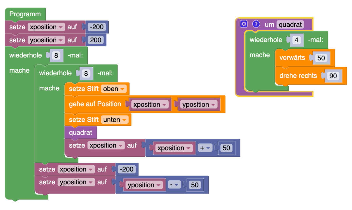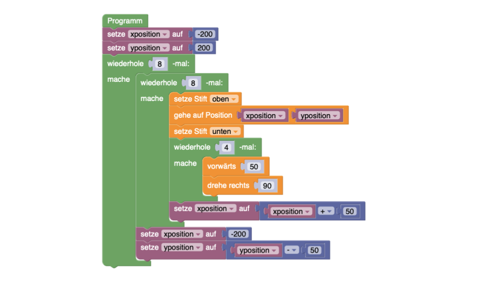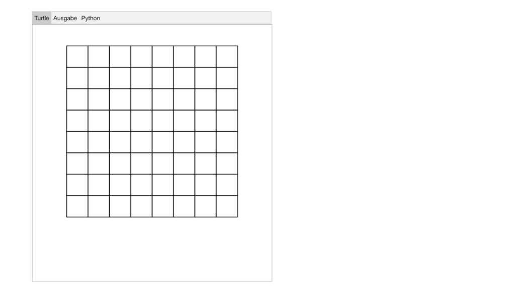 Am Ende entsteht ein 8x8-Gitter mit perfekt ausgerichteten Quadraten. Ein Schüler, der Turtle-Visuell beherrscht, kann mit dieser Beschreibung das Programm nachbauen.