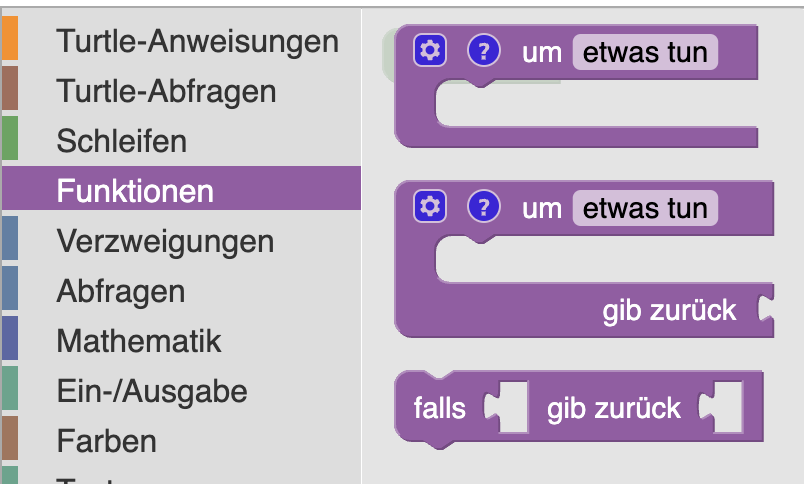 Eine Funktion in Turtle-Visuell ist eine Zusammenfassung von Anweisungen unter einem Namen. Mithilfe ihres Namens lässt sich eine Funktion im Hauptprogramm oder einer anderen Funktion aufrufen. Alle deklarierten (eingegebenen) Variablen können in einer Funktion verwendet werden. Den ersten Block verwendet man für eine Funktion die Anweisungen ausführt, ohne einen Wert zurückzugeben. Der zweite Block ist für eine Funktion, die einen in der Funktion berechneten Wert zurückgibt.Den dritten Block verwenden wir erst später.