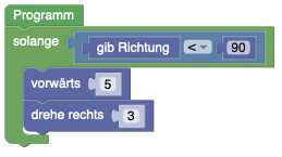 In das Eingabefeld des Blocks muss eine Bedingung gezogen werden. Die Anweisungen innerhalb des solange-Blocks werden solange ausgeführt, wie die Bedingung erfüllt ist. Die Bedingung sollte innerhalb des solange-Blocks so verändert werden, dass die Bedingung irgendwann nicht mehr erfüllt ist. Wenn das nicht der Fall ist, wird die Schleife und damit auch das Programm niemals beendet. |