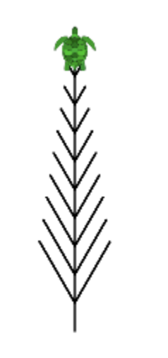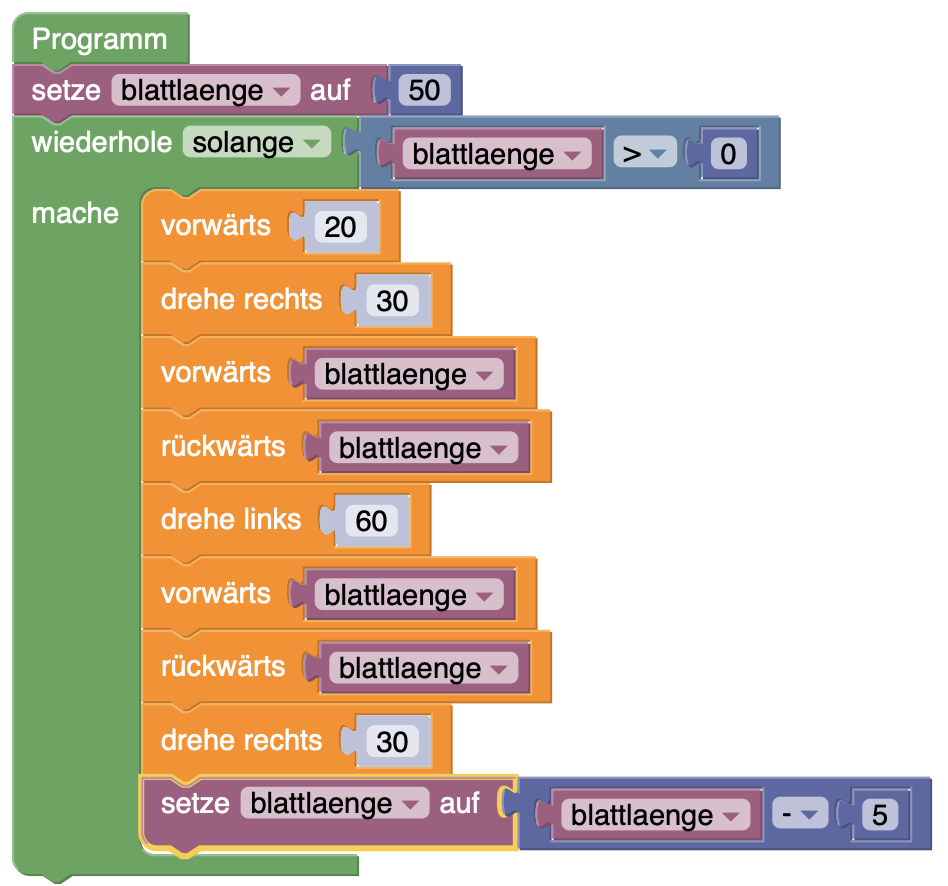 Dies ist ein etwas komplexeres Beispiel. Das in der Schleife gezeichnete Grundmuster besteht eus einer vertikalen geraden Linie der Länge 20 und einem am Ende eingesetzten Winkel von 300 mit dem Wert der Variablen blattlaenge als Länge. Bei jedem Schleifendurchlauf wird die blattlaenge um 5 Einheiten vermindert. Die Schleife wird solange durchlaufen, wie der Wert der Variablen größer als 0 ist. |