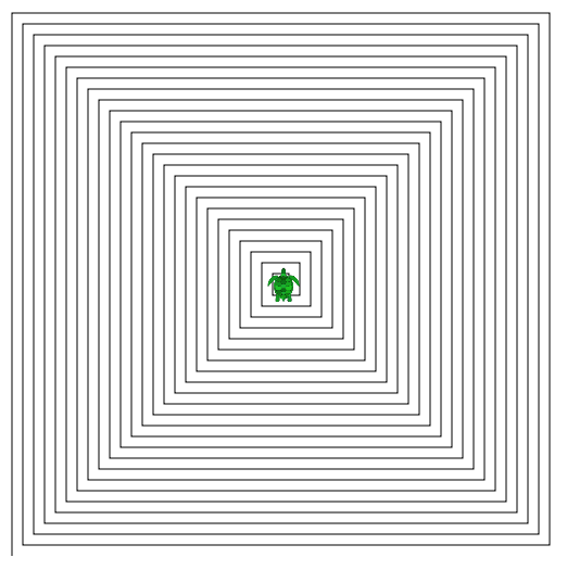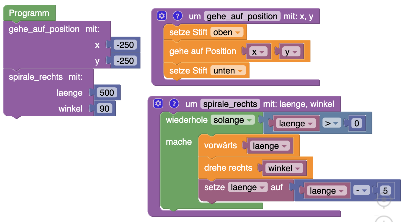 Beim Zeichnen der Spiralen ist es oft nicht einfach herauszufinden, wie oft die Vorwärts- und die Drehe-Anweisungen wiederholt werden sollen. Die nebenstehende Spirale hat eine Anfangslänge von 500 Einheiten. Bei jedem Schleifendurchlauf wird die Variable laenge um 5 vermindert. Da nach 100 Schleifendurchläufen laenge den Wert 0 hat, macht es dann keinen Sinn mehr weiter zu zeichnen.