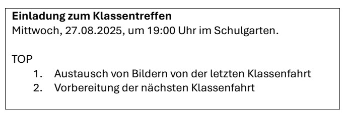 Lisa und Matteo haben die Aufgabe übernommen, die Einladung zu einem Klassentreffen der Klasse 9b zu organisieren. Sie bereiten eine Einladung auf Papier vor, die sie ausdrucken wollen, um sie dann an alle Schülerinnen und Schüler der Klasse zu verteilen.