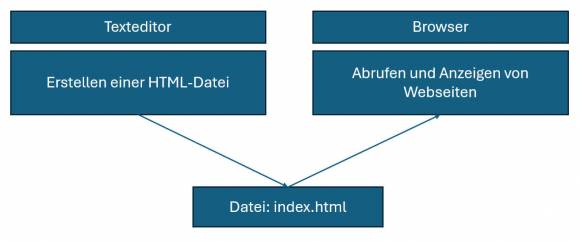 Die Datei ist eine reine Textdatei, ohne eine Formatierung. Die Datei wird mit einem Dateinamen mit der Endung .html gespeichert. Dadurch wird sichergestellt, dass die Datei im Browser geöffnet wird.